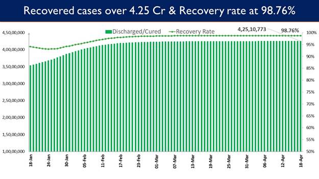 Consequently, India’s recovery rate stands at 98.76%. 1,985 patients have recovered in the last 24 hours and the cumulative tally of recovered patients (since the beginning of the pandemic) is now at 4,25,10,773.